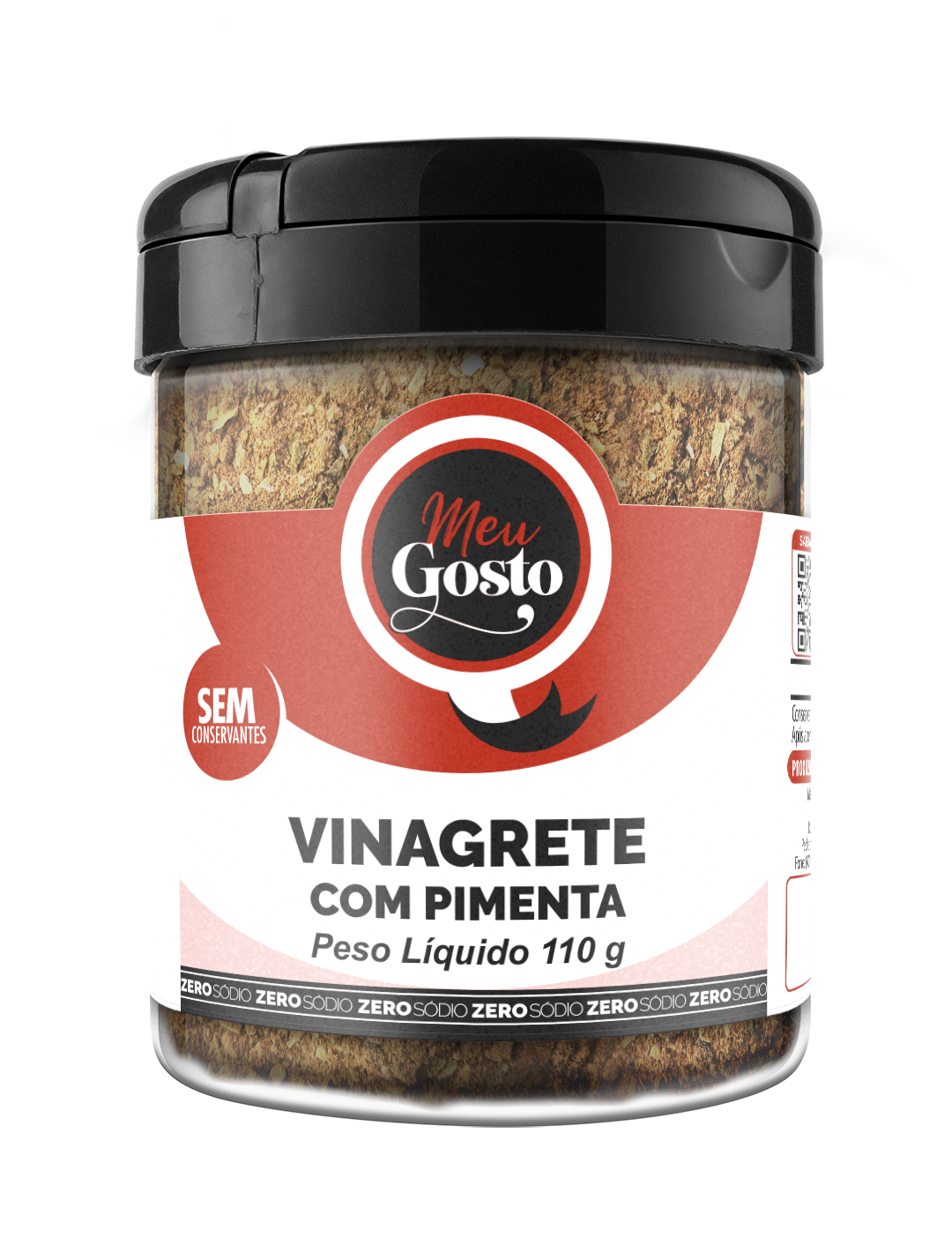 O tempero Vinagrete com Pimenta Meu Gosto pode ser utilizado no preparo de saladas, molhos, omeletes, recheios de tortas e assados. RÓTULO BASE VERMELHO 180C