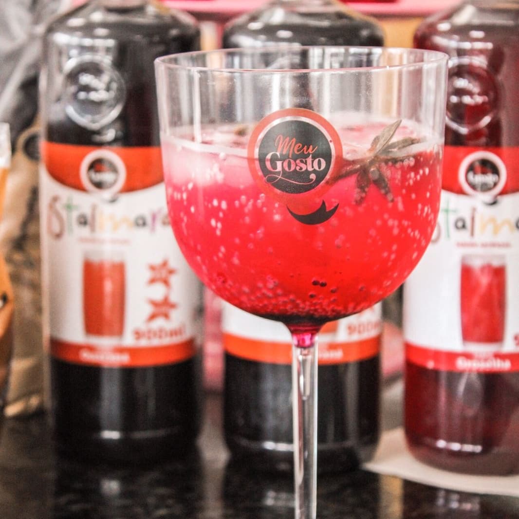 Acrescente o vinho branco dentro da taça de gin,em seguida acrescente a água tônica os cubos de gelo .Finalize com o xarope alimentício Istaimara Meu Gosto sabor framboesa a pimenta rosa Meu Gosto e o anis estrelado Meu Gosto.